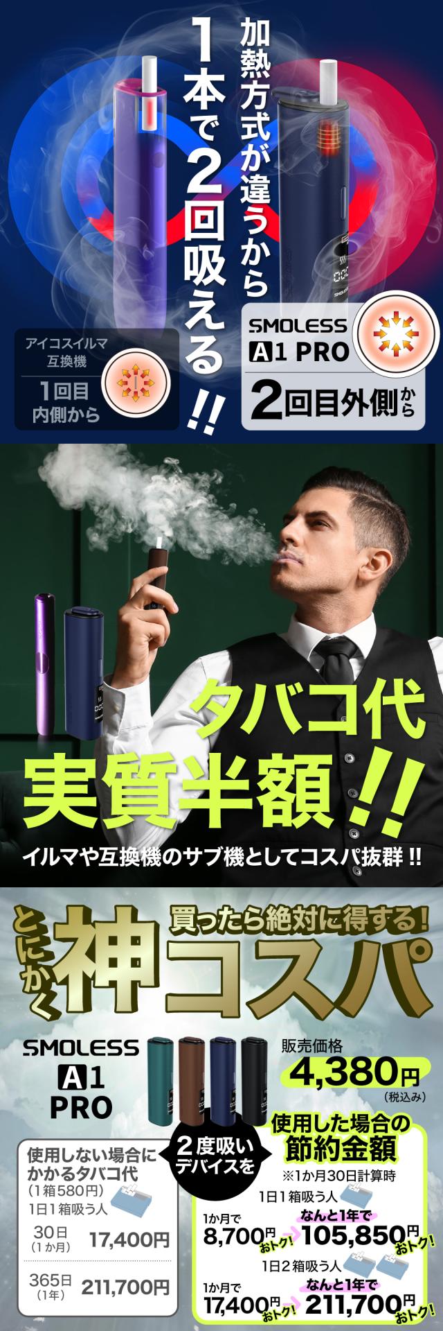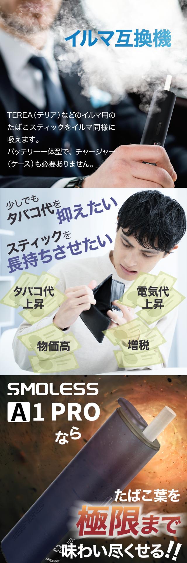 人気爆発中のアイコスイルマやアイコスイルマワンで吸い終えたシケモクを再利用できるアイコスイルマ互換機の 新ブランド ” SMOLESS ”(スモーレス)から、待望の新製品「SMOLESS A1 PRO」が新登場!