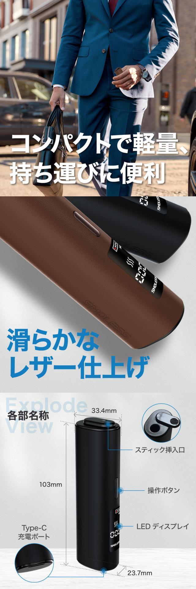シンプルでレザーに覆われたクールなデザインと、ボタン1つのかんたん操作。美味しい吸い心地、そしてお財布にも優しいこの製品をぜひお試しください!