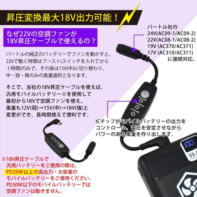 | 商品説明 | 『これ買っとけば間違いなし!』 昇圧ケーブルとセットで使える モバイルバッテリーも販売中! ●PD対応のモバイルバッテリーの出力を18Vに昇圧することができるType-C昇圧アダプターです。 ●このアダプタにより、モバイルバッテリーをファン付き作業服のバッテリーとして使用できるようになります。 ●USB端子は断線に強いL型コネクタ。 ●胸元のケーブルのもたつきも軽減します。 ●風量を3段階で調節できるスイッチが付いており、気温や体調に合わせて簡単に風量が調節できます。 |