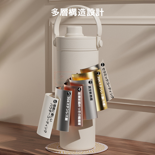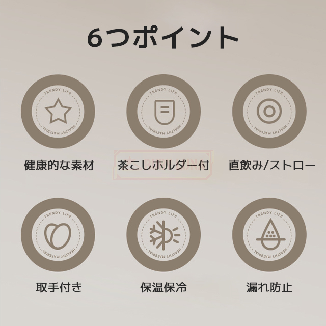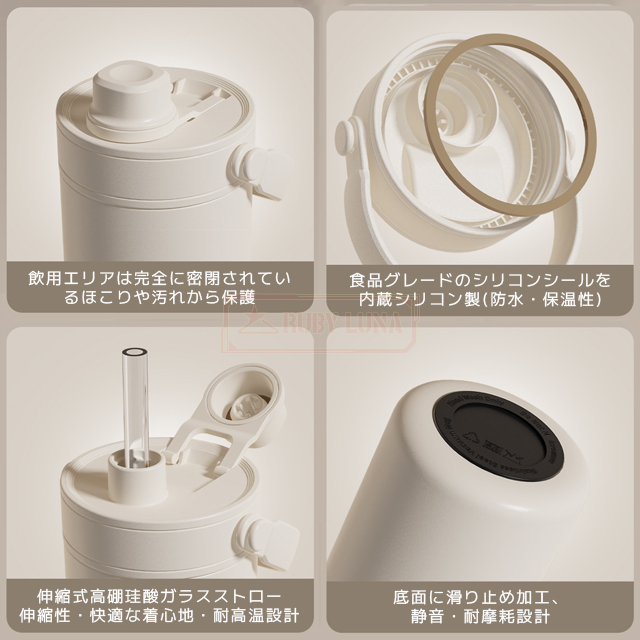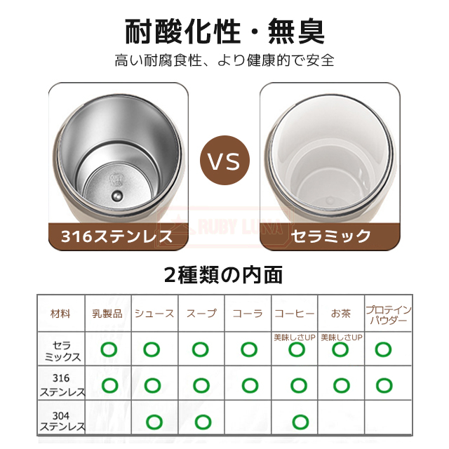 | 素材 | ◆本体316ステンレス鋼製の内びん/陶器製の内びん ◆蓋:PPプラスチック+AS+シリコン ◆ハンドル/ストロー:シリコーン/ガラス |