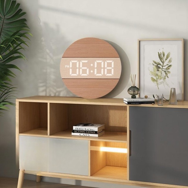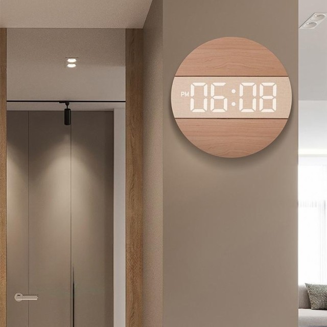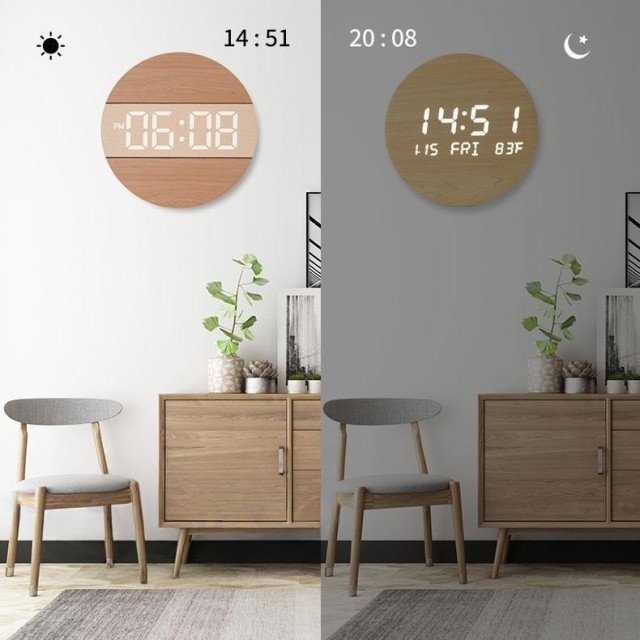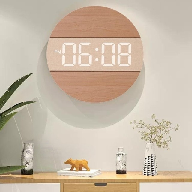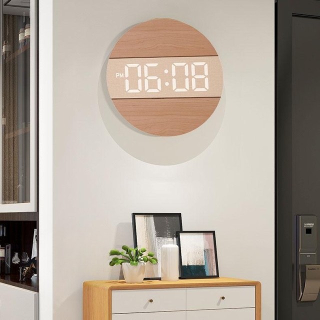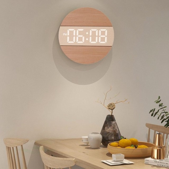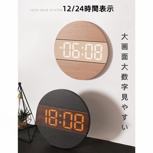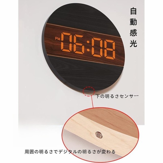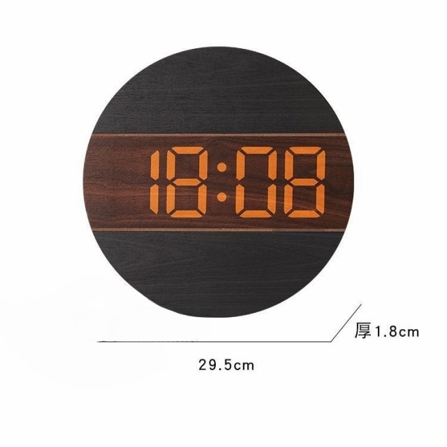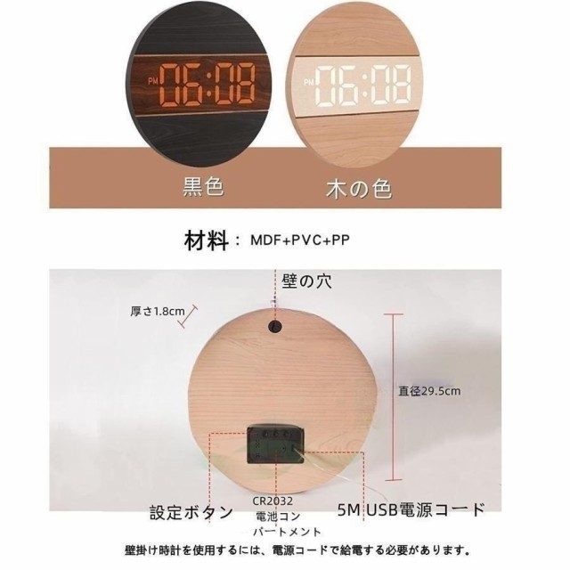 【時計仕様】サイズ:12インチ(直径30CM)*厚さ2CM、重量0.95KG、LED大数字、石英静音ムーブメント、材質:木製+PVC、USB給電、5mコード付き、電源アダプター(別売)は安定出力5V/500MA-1000MA、掛け時計内にはメモリー付き。