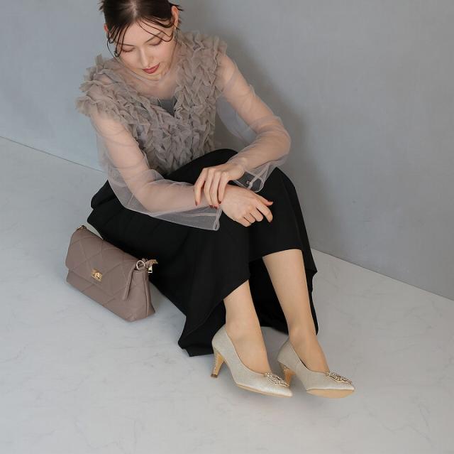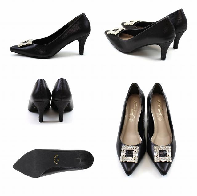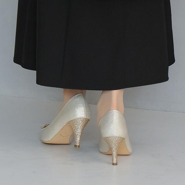 【店内全品10%OFFクーポン】パンプス 結婚式 痛くない 歩きやすい 即納 24春 7cm ヒール ビジュー モチーフ サテン シルバー ゴールド ブラック パーティ グリッター j7318al