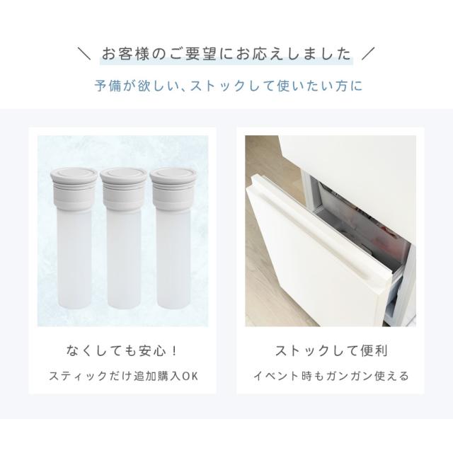 | 【スティックだけの単体販売開始!】 人気の氷のうに、スティックだけのスペアが登場。お客様の「洗い替えしたい」「予備が欲しい」などの声にお応えしました。冷凍庫にストックして、イベント時などもガンガンお使いいただけます♪ |