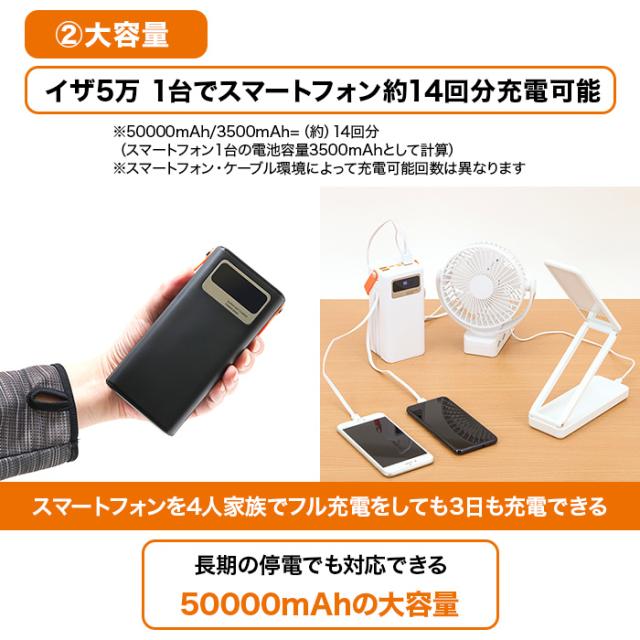 ※50000mAh/3500mAh=(約)14回分(スマートフォン1台の電池容量3500mAhとして計算)