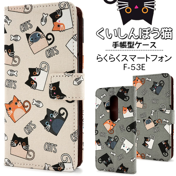 スマホケース らくらくスマートフォン F-53E用 手帳型 くいしんぼう猫 携帯カバー 可愛い 猫柄 スマホカバー にゃんこ 猫 猫模様 装着簡単 携帯ケース オシャレ カジュアル お洒落 ねこ 横開き 大人可愛い スマートフォンケース にゃんこグッズ