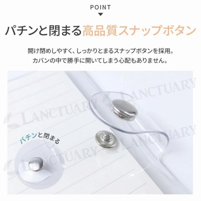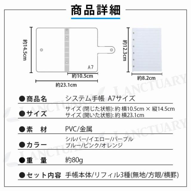 | 主な仕様 | 商品名: A7 クリアシステム手帳 種類 (カラー): シルバー、イエロー、パープル、ブルー、ピンク、オレンジ サイズ (閉じた状態): 約 横10.5cm × 縦14.5cm サイズ (開いた状態): 約 横23.1cm 重さ: 約80g 素材: PVC、金属 付属品: A7クリアシステム手帳本体、無地リフィル(60枚)、方眼リフィル(60枚)、横罫リフィル(60枚) |
