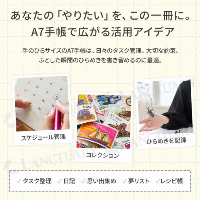 | 商品の説明 | コンパクトなA7サイズのクリアシステム手帳です。 透明なPVC(ポリ塩化ビニル)製のカバーを採用しており、カバーの内側にお好みの写真やイラスト、カード類を挟むことで、オリジナルの表紙デザインを作成できます。季節や気分に合わせて表紙のアレンジを手軽にお楽しみいただけます。 手帳のリング部分には、耐久性に優れた金属製の6穴リングバインダーを使用しています。これにより、リフィルの交換や追加がスムーズに行え、長期間の使用に適した設計です。 セット内容として、3種類のリフィルを各60枚、合計180枚付属しています。無地リフィルは自由な記述やスケッチに、方眼リフィルは図や表を伴う記録やノートに、横罫リフィルは一般的な筆記や日記など、様々な用途に対応します。ご購入後すぐに、これらのリフィルをお使いいただけます。 スケジュール管理、タスク整理、アイデアメモ、趣味の記録といった幅広いシーンでの活用が可能です。 本体の重量は約80gと軽量で、携帯性にも優れているため、日々の持ち運びにも便利です。ビジネスからプライベートまで、様々な場面でご活用ください。6色のカラーバリエーションから、お好みの色をお選びいただけます。 |