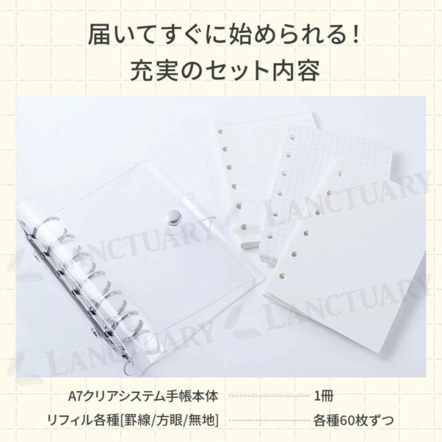 付属品: A7クリアシステム手帳本体、無地リフィル(60枚)、方眼リフィル(60枚)、横罫リフィル(60枚)