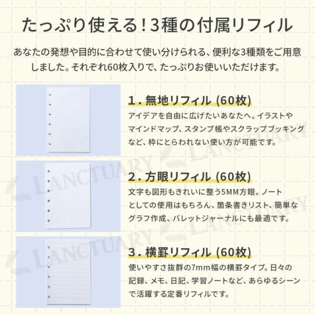 セットには、無地、方眼、横罫の3種類のリフィルが各60枚、合計180枚付属しており、多様な筆記ニーズに対応します。スケジュール管理、メモ帳、日記帳など、様々な用途にご利用いただけます。