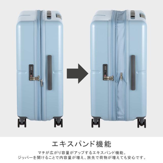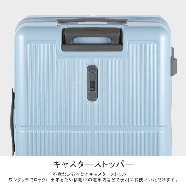 | クロスラインが映える鏡面の鮮やかな『ファームロード』シリーズ 容量がアップするエキスパンド機能や、坂道や電車で活躍するキャスターストッパー、 ちょっとしたお買い物袋を下げられるサイドフックなど機能盛り沢山のシリーズです。 〈機能説明〉 ● チェックインサイズ/M 5〜7日の旅行向け。 ● エキスパンド機能 マチが広がり容量がアップするエキスパンド機能。 旅先で荷物が増えても安心です◎ ● 双輪キャスター 旋回性に優れ、容易に方向転換可能な双輪キャスター。 ● キャスターストッパー 不意な走行を防ぐキャスターストッパー。 ワンタッチでロックが出来るため移動中の電車内などで便利にお使いいただけます。 ● サイドフック ハンドバッグや買い物袋等をひっかけられるサイドフック機能。 ● 内装 両面仕切りで荷こぼれを防ぎ、不意な開閉の際も荷物が見えにくく安心です。 ● TSダイヤルロック TSダイヤルロック(Travel Sentry®認可ロック)搭載で、施錠したまま預け入れ可能。 ダイヤル式ロックのため鍵の付属はしません。 |