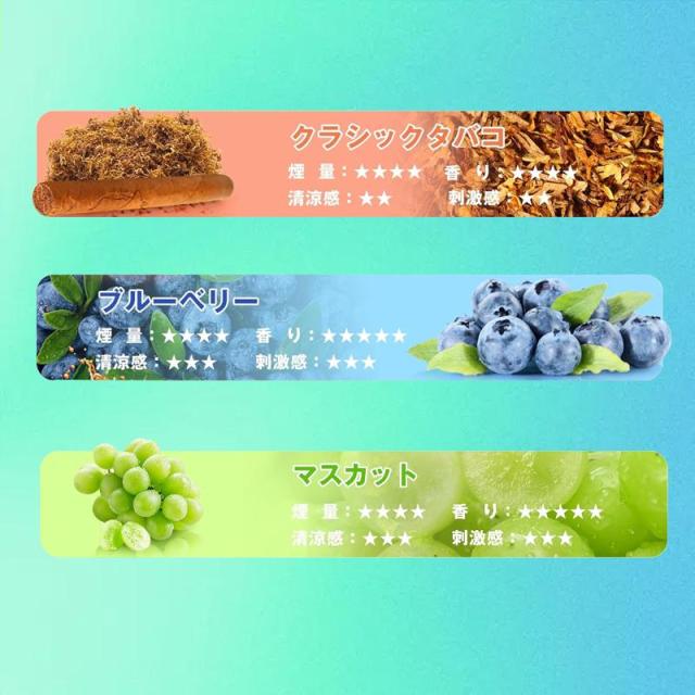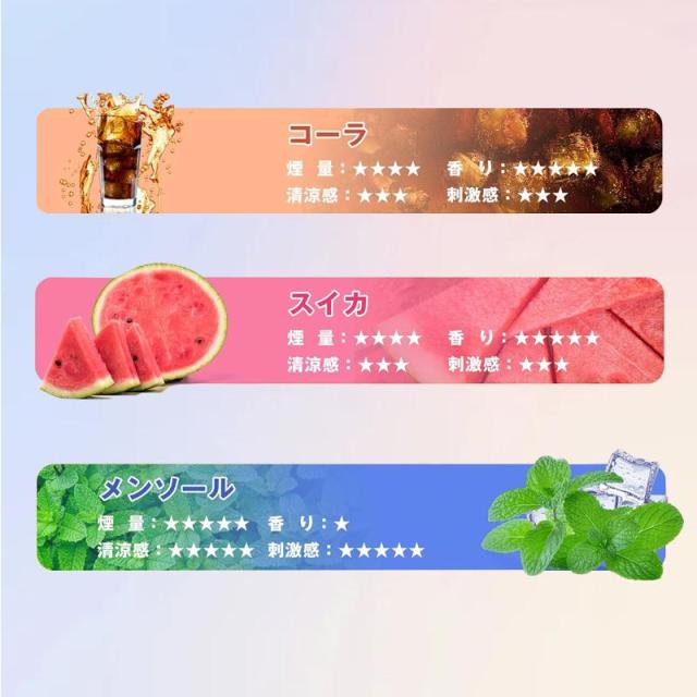風味:マスカットアイス、コーラアイス、スイカアイス、メンソールアイス、ブルーベリーアイス、クラシックタバコアイス