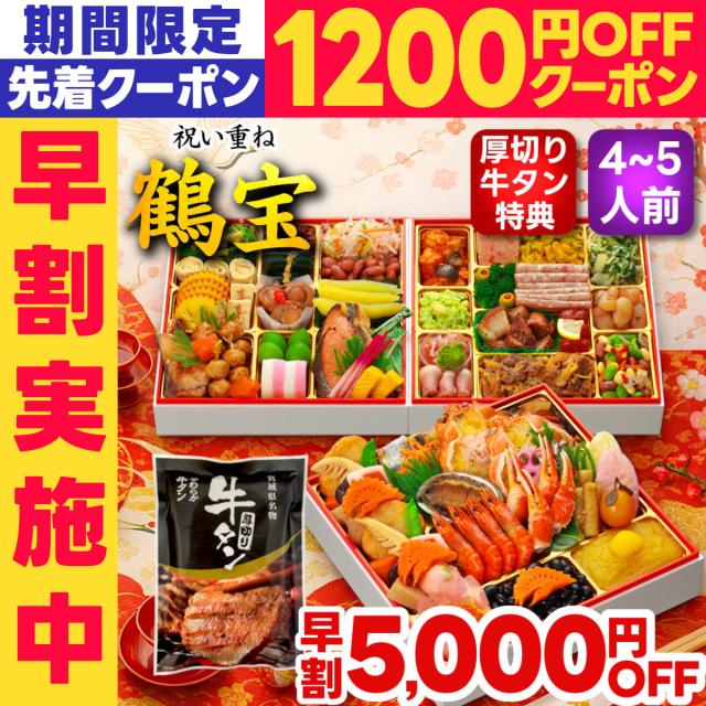 \1200円クーポン/ おせち 2026 おせち料理 早割 予約 【鶴宝】 全66品 4人前 5人前 8.5寸 お節料理 お節 御節 冷凍 牛タン 鏡餅 お供え餅 和洋中 洋風 和洋 中華 お歳暮 ギフト お正月 正月 美味しい 人気 有名 送料無料 蔵王福膳