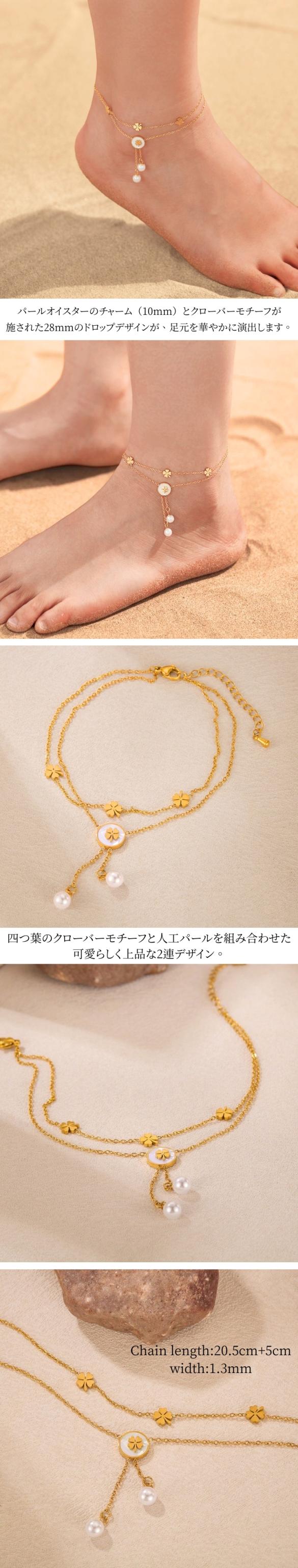 アンクレット つけっぱなし レディース 可愛い サージカルステンレス 四つ葉のクローバー パール チャーム アンクレット 2連チェーン シンプル 金属アレルギー k18 金メッキ ゴールド 18金仕上げ ステンレスチェーン 錆びない 四つ葉チャーム かわいい カジュアル 華奢