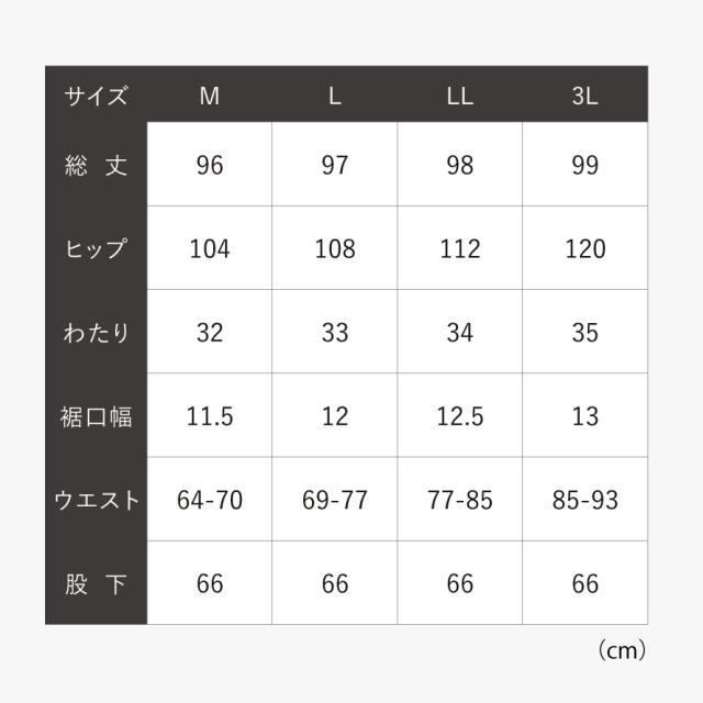 ■サイズ:M/総丈96、ヒップ104、わたり32、裾口幅11.5、ウエスト64-70、股下66、L/総丈97、ヒップ108、わたり33、裾口幅12、ウエスト69-77、股下66、LL/総丈98、ヒップ112、わたり34、裾口幅12.5、ウエスト77-85、股下66、3L/総丈99、ヒップ120、わたり35、裾口幅13、ウエスト85-93、股下66cm