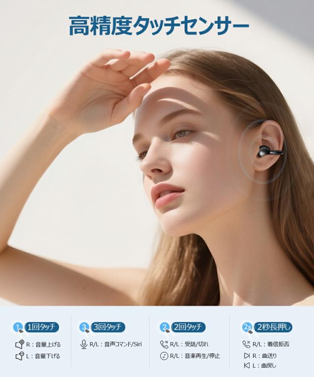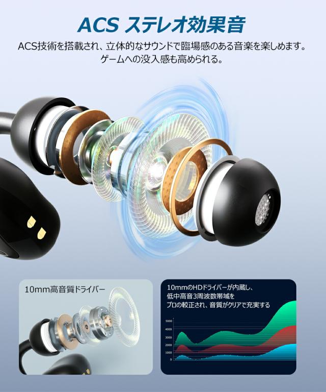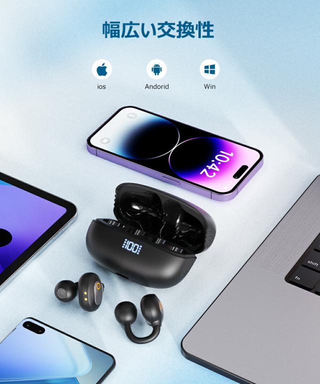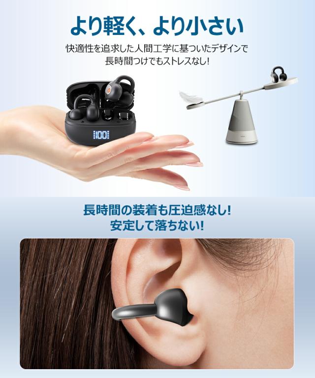 革新的な人体工学を応用して開発された、圧迫感がないイヤーカフ型イヤホン。耳を塞がないため、耳道を傷つけることも心配がありません。長時間装着しても耳が痛くなることはありません。Bluetooth5.4強力な信号を発信でき、10m以上の長距離伝送が可能