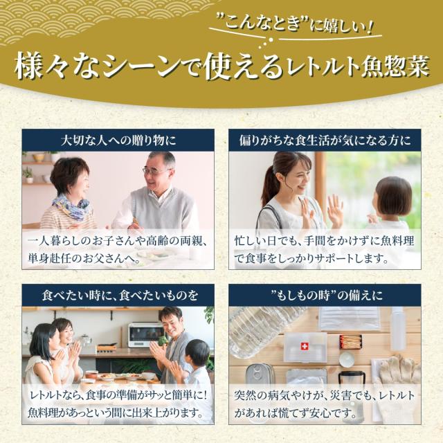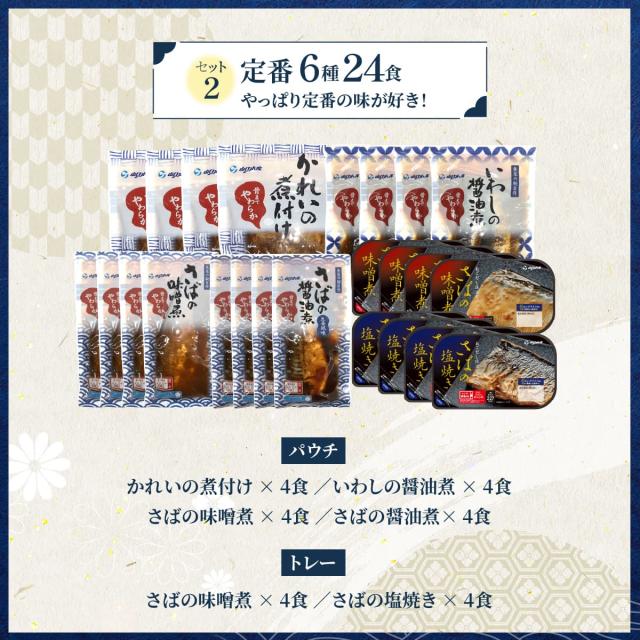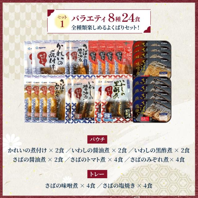 ■ バラエティ8種24食 ▽レトルトパウチ いわしの醤油煮 150g×2 いわしの黒酢煮 150g×2 さばの醤油煮 100g×2 さばのトマト煮 100g×4 さばのみぞれ煮 100g×4 かれいの煮付け 100g×2 ▽トレー さばの味噌煮 1枚×4 さばの塩焼き 1枚×4 ■ 定番6種24食 ▽レトルトパウチ いわしの醤油煮 150g×4 さばの味噌煮 100g×4 さばの醤油煮 100g×4 かれいの煮付け 100g×4 ▽トレー さばの味噌煮 1枚×4 さばの塩焼き 1枚×4 ■ 一味違う6種24食 ▽レトルトパウチ いわしの醤油煮 150g×4 いわしの黒酢煮 150g×4 さばの味噌煮 100g×4 さばのトマト煮 100g×4 さばのみぞれ煮 100g×4 かれいの煮付け 100g×4 3種類のセットからお選びいただけます。 |