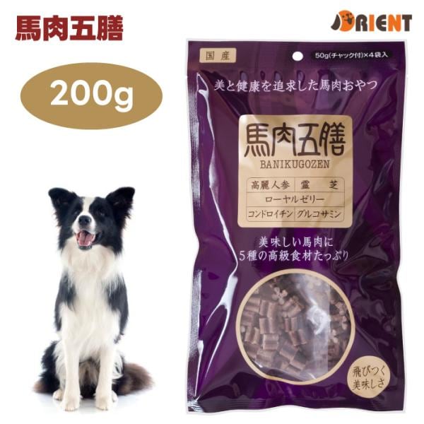 馬肉、乾燥マッシュポテト、ソルビトール、澱粉分解物、澱粉、グリセリン、カゼ インナトリウム、高麗人参、霊芝、ローヤルゼリー、コンドロイチン、グルコサミン、かき殻、ハトムギ、鹿の 角、まむし、魚骨、ローズマリー抽出物、保存料(ソルビン酸カリウム)、リン酸ナトリウム、酸化防止剤(ビ タミンC、ビタミンE)