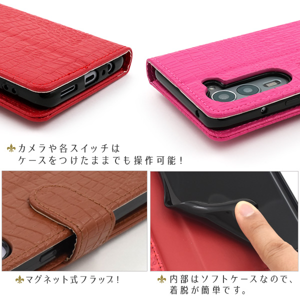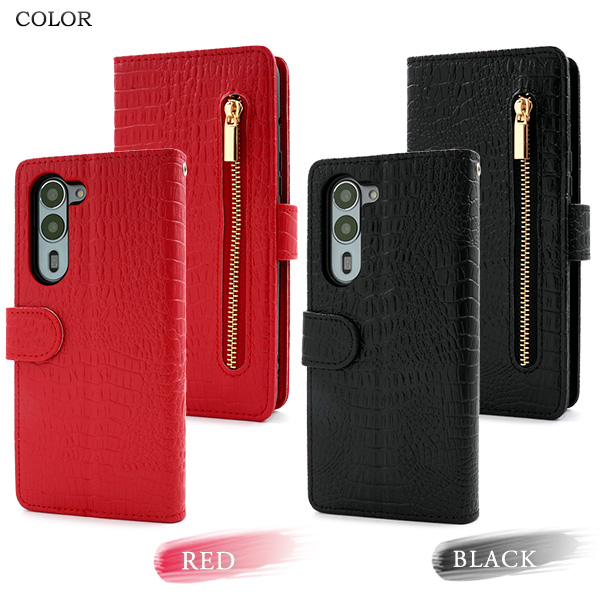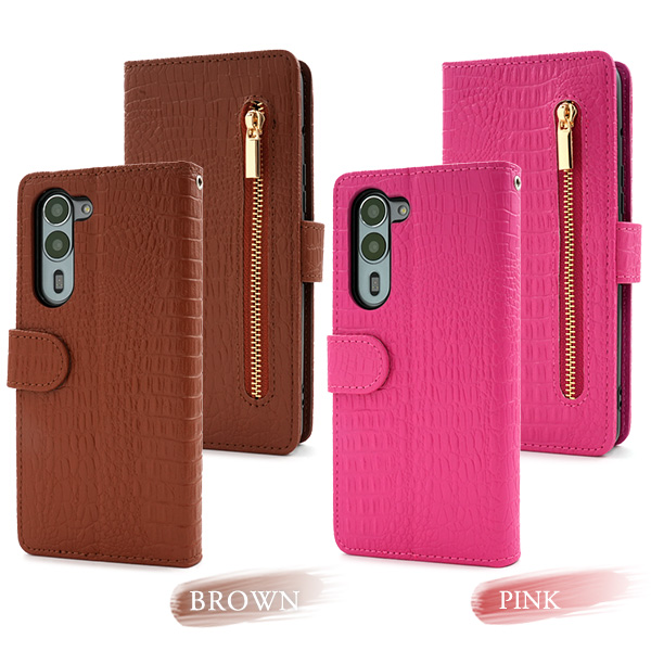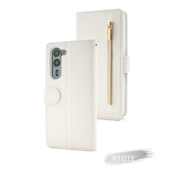 衝撃やキズなどからスマートフォンを守ります。 また、内部はソフトケースなので着脱が簡単です。 背面を折り返すとスタンドとして使用できるので、動画視聴に便利です。 横開きタイプなので、手帳のように使うことができます。 落下防止に最適なストラップホール付きです。 外側にファスナーポケットが付いているので、ちょっとした財布や小銭入れ代わりになって便利! また、内側に2つのカードポケットとサイドポケットが付いています。 高級感溢れるクロコダイルレザーデザイン。 ビジネスやカジュアルなど様々なシーンで活躍します。 | ||||||||||||||