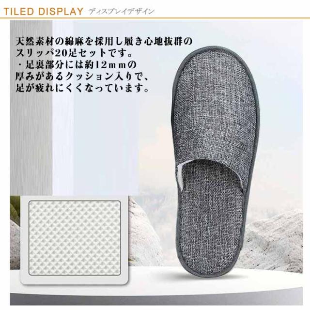 | ・来客用や旅行など多くのシーンで役立つ使い捨てスリッパです。 ・天然素材の綿麻を採用し履き心地抜群のスリッパ20足セットです。 ・足裏部分には約12mmの厚みがあるクッション入りで、足が疲れにくくなっています。 ・通気性に優れているため、素足で履いても快適にお過ごしいただけます。 ・軽量設計で持ち運びにもかさばらず、来客用・旅行・夜行バス・飛行機・新幹線・モデルルーム・オフィスなどさまざまなシーンで活躍します。 ・男女兼用サイズでご家族でお使いいただけます。 ・自宅・オフィスなどでの防災グッズとして常備しておくのもおすすめです。 | |