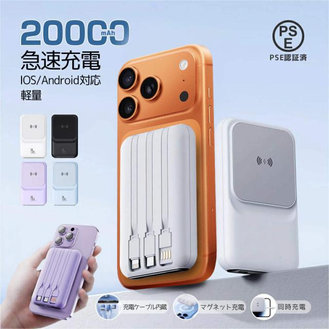 【TV・SNSで話題沸騰】モバイルバッテリー ワイヤレス充電 20000mAh 大容量 小型 軽量 5台同時 マグセー 3つケーブル内蔵 急速充電 22.5W高出力 magsafe 充電器 タイプc PSE認証 残量表示 旅行 出張 停電 防災 iPhone/Android対応 機内持ち運び可 お歳暮