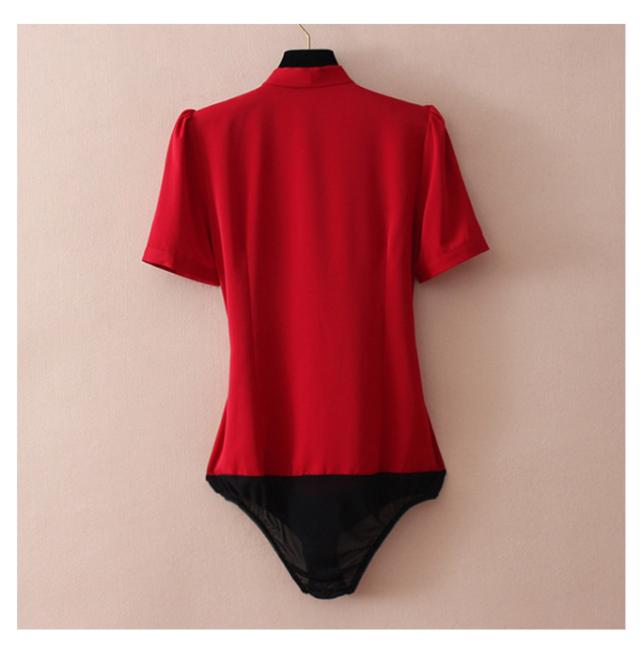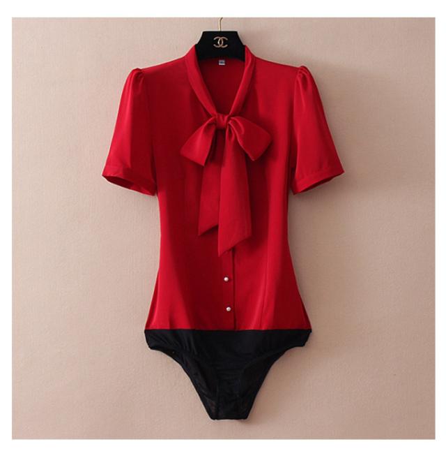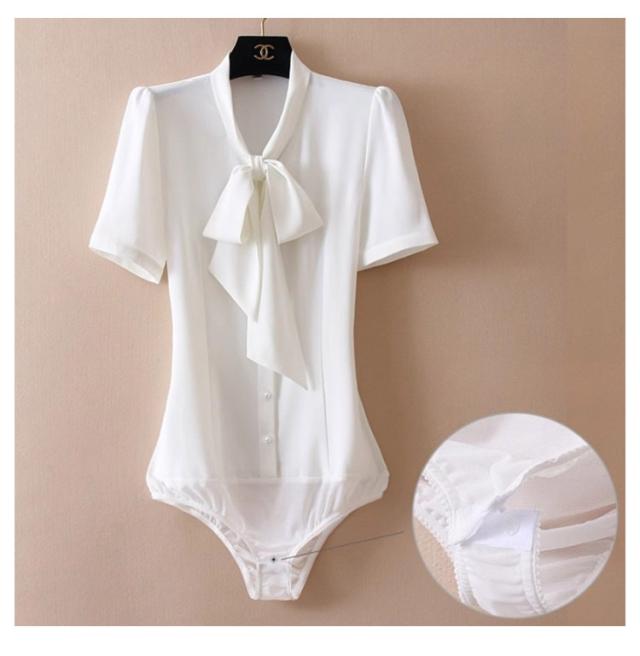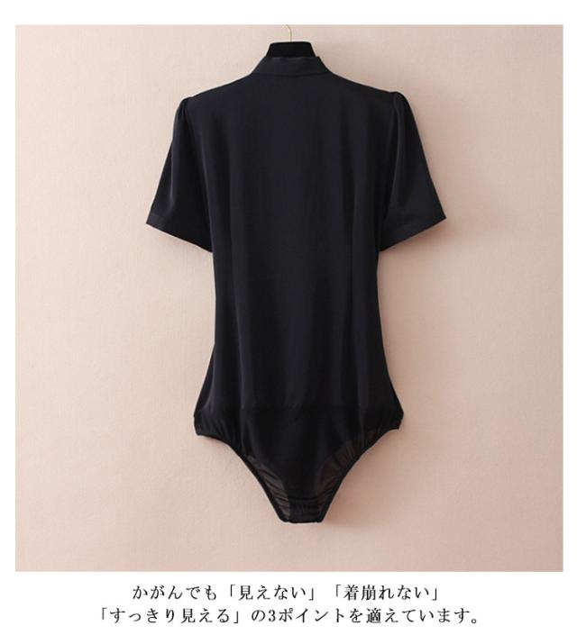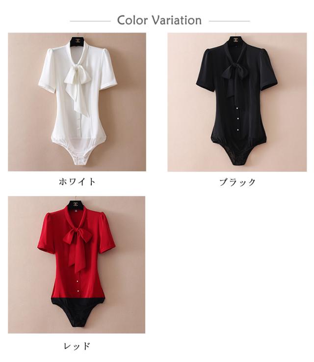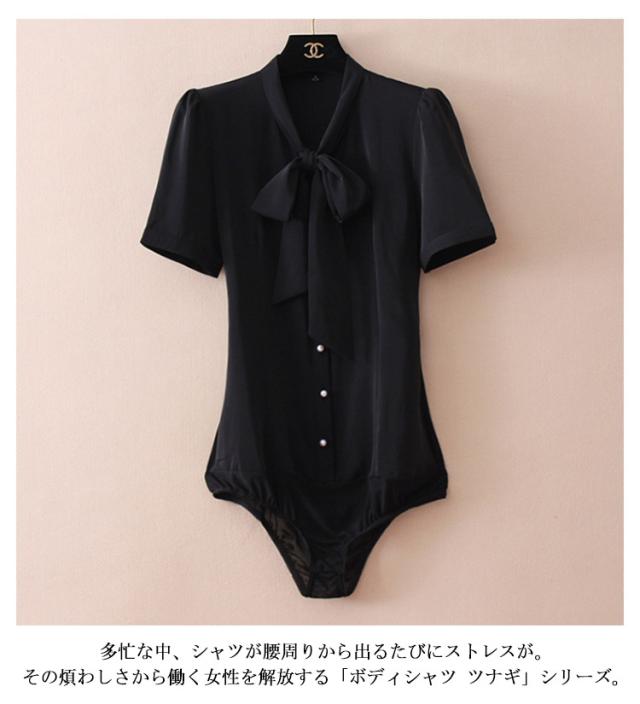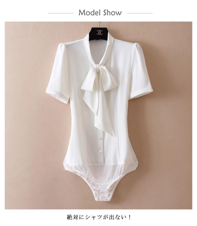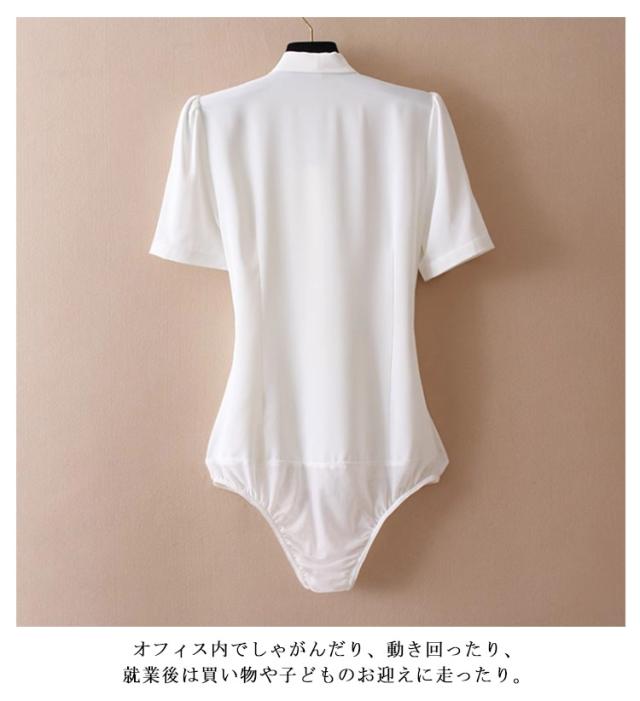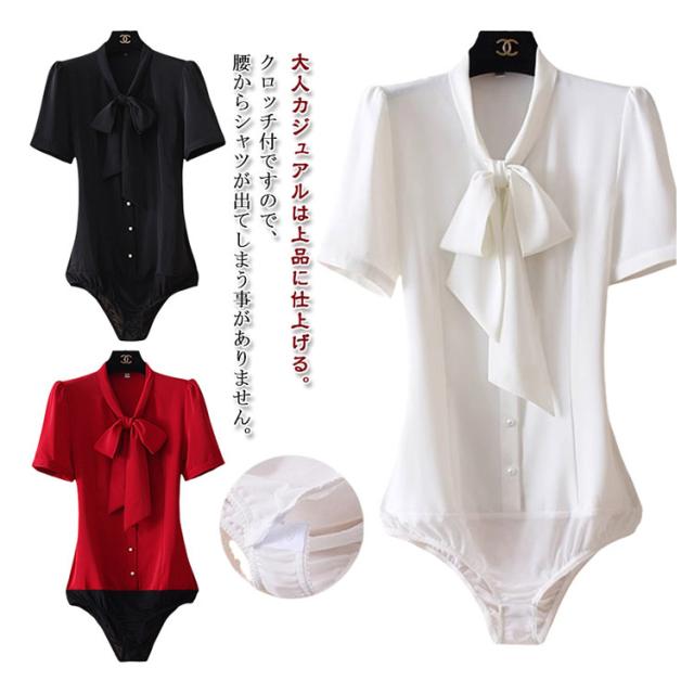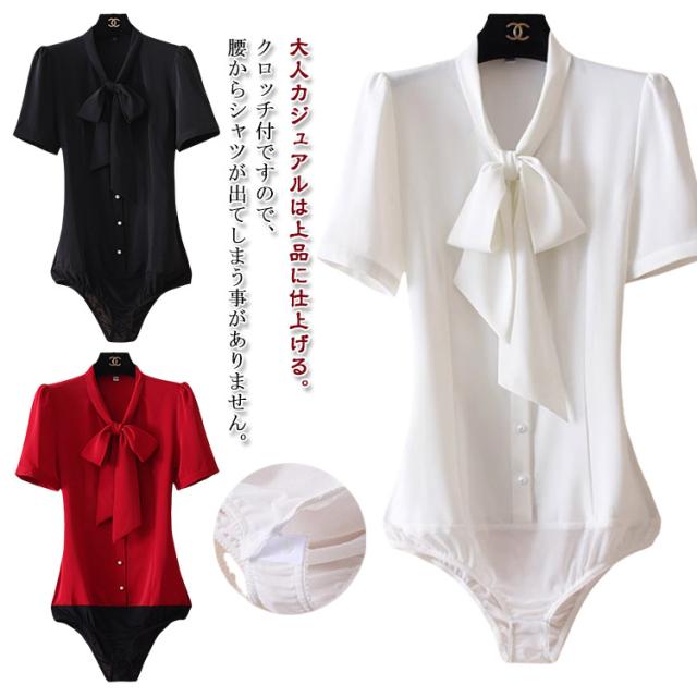 ワイシャツ レディース ボディーブリファー ボウタイ リボン ビジネス オフィスブラウス Vネック ボディシャツ 無地 つなぎ 半袖 仕事 ブラウス フォーマル 通勤 リクルート 制服OL シンプル 入職 就職 クロッチ付き パンツ型シャツ 着崩れしない 高級感トップス