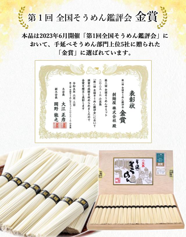 【産地直送】 金賞 小豆島 そうめん 手延べそうめん 1.9kg 50g×38束 【北海道沖縄県除き送料無料】 香川県 国産小麦100% 木箱入り 高級 素麺 手延べ 創麺屋 高品質 本物志向 ギフト 母の日 父の日 お中元 御歳暮 内祝 御礼 贈答品 のし対応 全国そうめん鑑評会 金賞受賞品