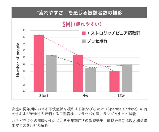 | 人での臨床試験で効果を確認! 中高年期女性を対象としたエストロリッチピュア12週間の摂取臨床試験において、「疲れやすい」の軽減が認められました。