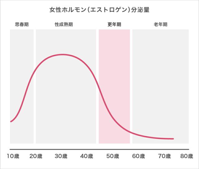 | 40代から始まる、女性のカラダの転換期。 40代を過ぎたころから、女性ホルモン(エストロゲン)の分泌は年々減少していきます。