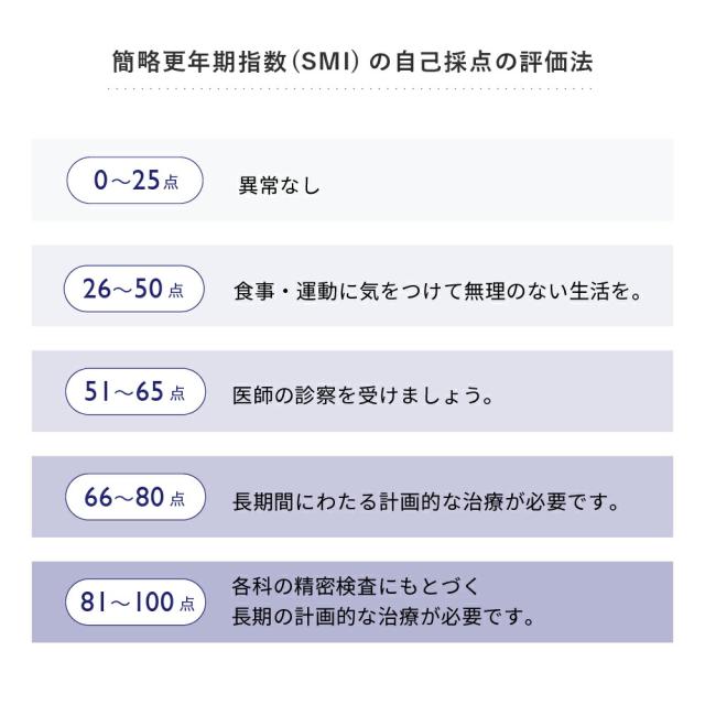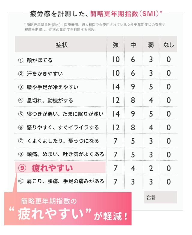 | エストロリッチピュアが軽減する「疲労感」とは? 「簡略更年期指数(SMI)」で疲労感を計測。 「簡略更年期指数(SMI)」とは、医療機関、産婦人科医でも使用されている女性更年期症状の有無や程度を把握し、症状の重症度を判断する指数のことです。