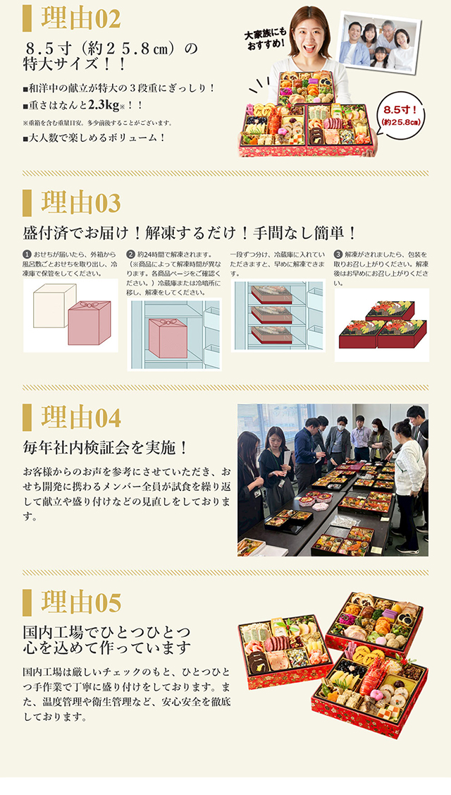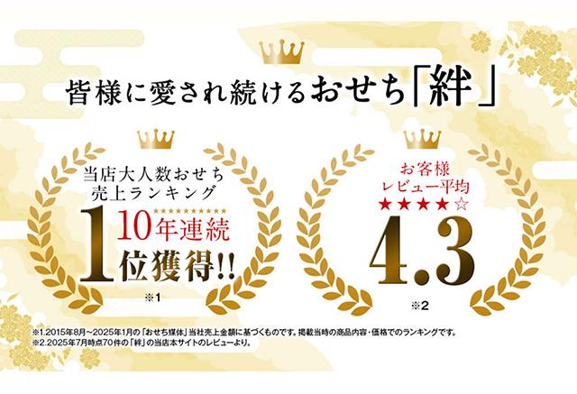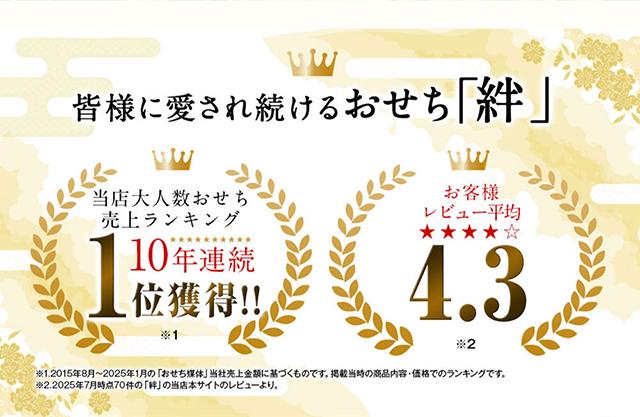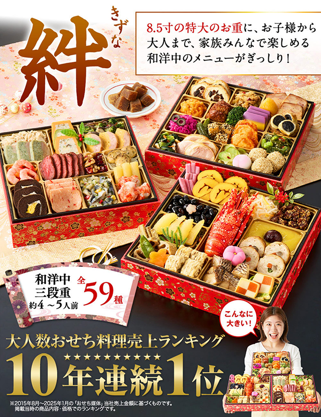 10年連続大人数おせち料理売上げランキング第1位!(※)8.5寸の特大のお重に、お子様から大人まで、