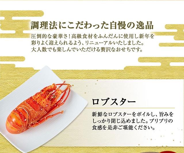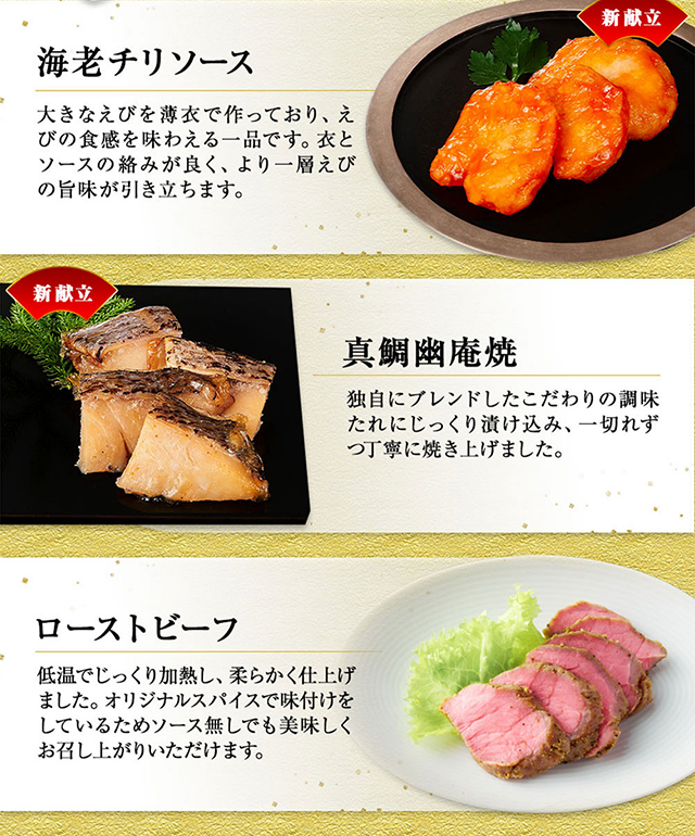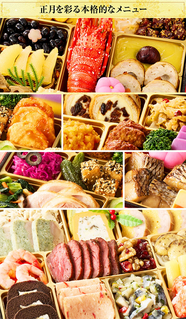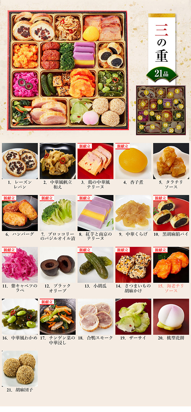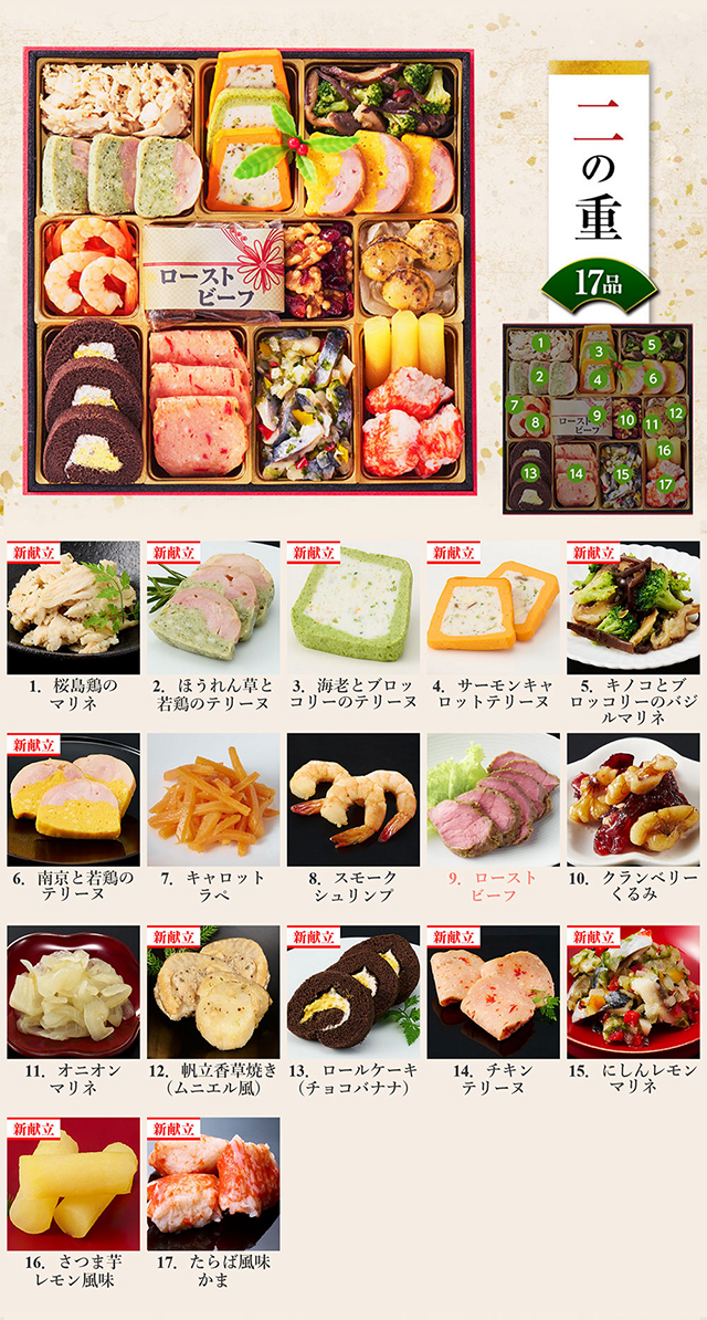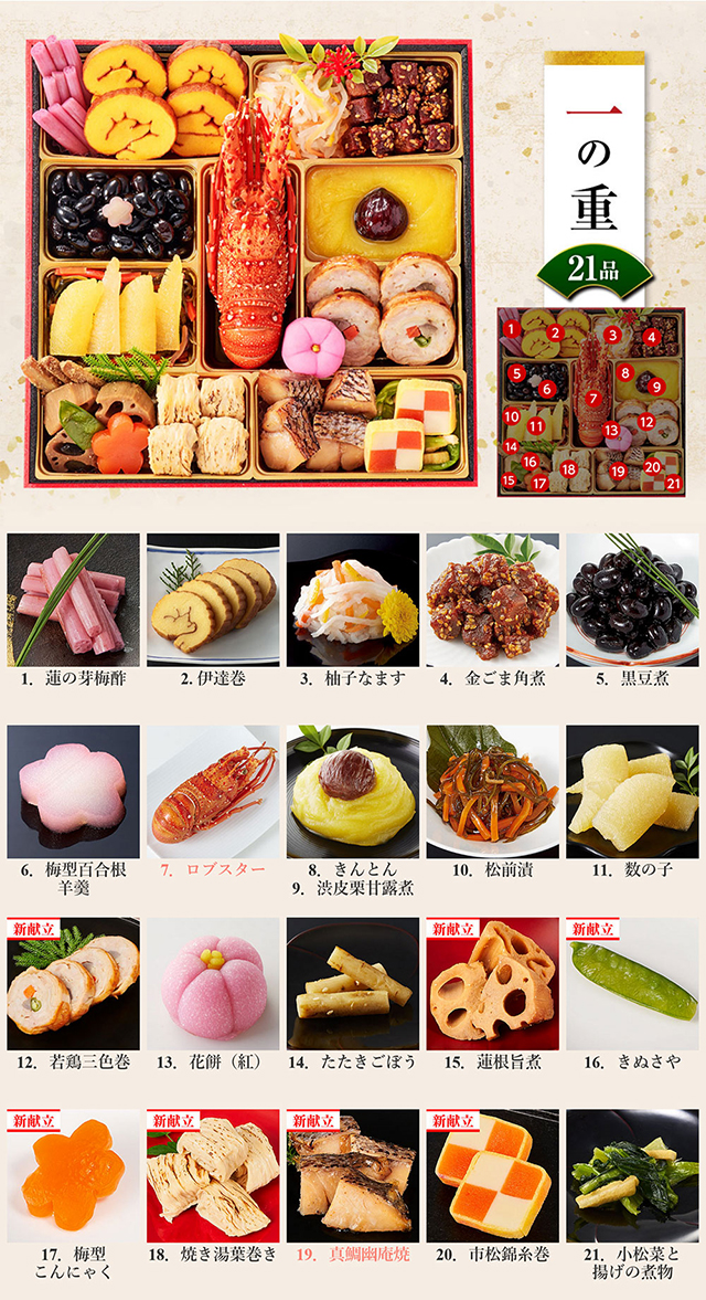 ◆蓮の芽梅酢◆伊達巻◆柚子なます◆金ごま角煮◆黒豆煮◆梅型百合根羊羹◆ロブスター◆きんとん◆渋皮栗甘露煮◆松前漬◆数の子◆若鶏三色巻◆花餅(紅)◆たたきごぼう◆蓮根旨煮◆きぬさや◆梅型こんにゃく◆焼き湯葉巻き◆真鯛幽庵焼◆市松錦糸巻◆小松菜と揚げの煮物