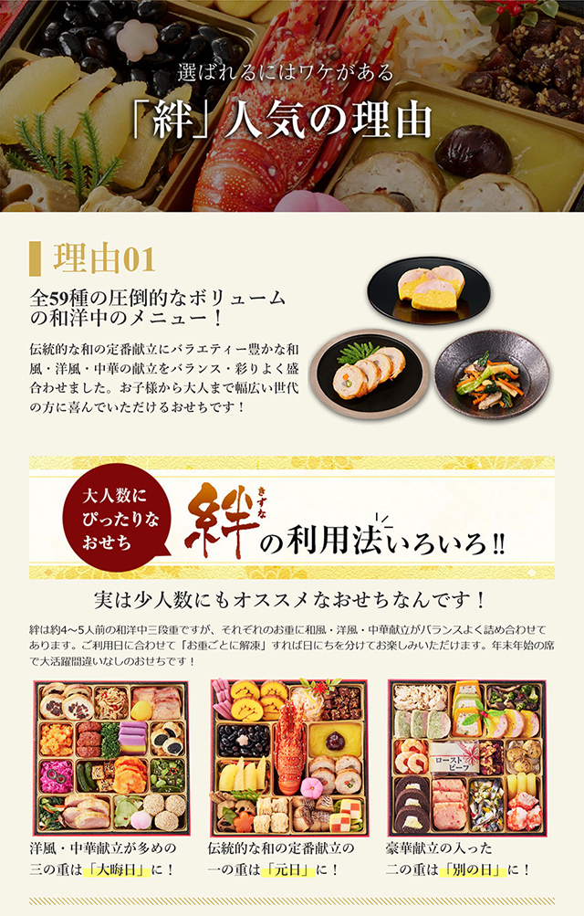 お届け内容:和洋中三段重(盛付済)/約4−5人前/全59種