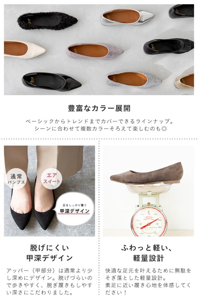 履き心地にこだわったパンプス『エアスイート』シリーズのフラットヒールタイプ。