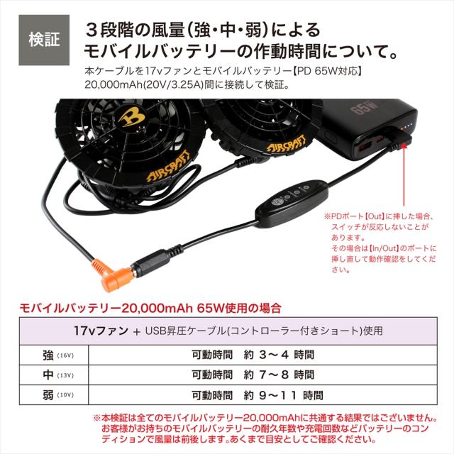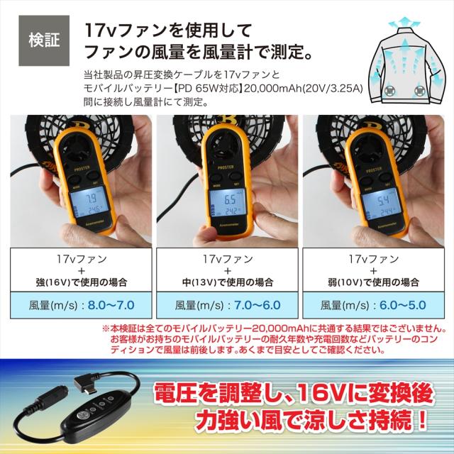| 商品説明 | 『これ買っとけば間違いなし!』 昇圧ケーブルとセットで使える モバイルバッテリー販売中! ●PD対応のモバイルバッテリーの出力を16Vに昇圧することができるType-C昇圧アダプターです。 ●このアダプタにより、モバイルバッテリーをファン付き作業服のバッテリーとして使用できるようになります。 ●USB端子は断線に強いL型コネクタ。 ●胸元のケーブルのもたつきも軽減します。 ●風量を3段階で調節できるスイッチが付いており、気温や体調に合わせて簡単に風量が調節できます。 |