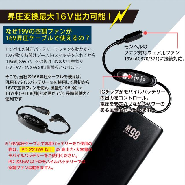 mont-bell モンベル ファン対応ウェア用 AC370 371 ファン 対応 変換ケーブル 空調ウェア 19V AC370/371 対応 スイッチ付き 【16V-C】 モバイルバッテリー Type-C昇圧 アダプター 16V L型 Type-C PD対応 変換 昇圧ケーブル USB-C タイプC ベスト ショートスリーブパ ーカ