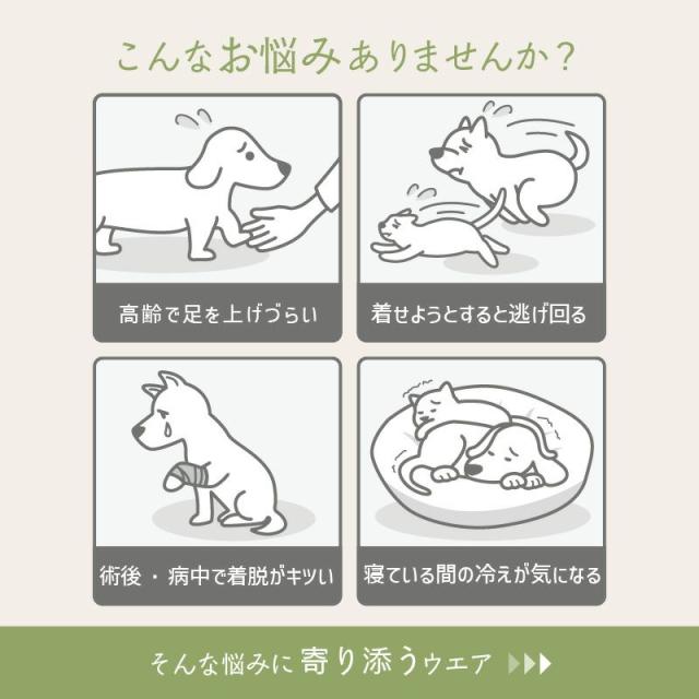 シニアや療養中のケアに適しており、頭を通すのが苦手な子にもストレスなく使えるのが魅力。また、パピーの初めての服としても気軽に取り入れやすい一着です。