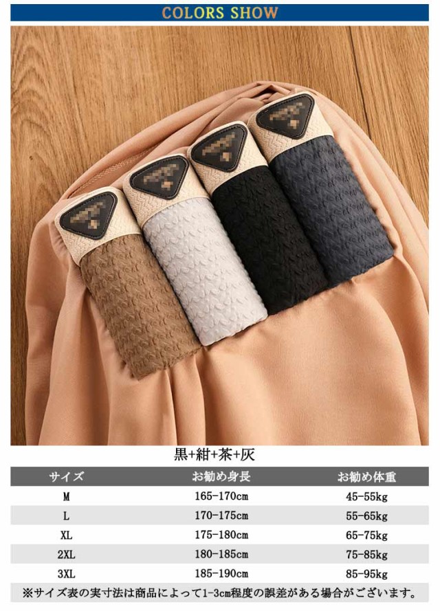 | メンズ冷感ボクサーパンツ 4枚セット! [ツルツル・サラサラ素材] 肌触りの良いなめらかな生地でやみつきになる快適な穿き心地。伸縮性・通気性も良くスポーツなど運動の際にも着用可能。 [抜群の通気性] 高い通気性で蒸れにくく快適な着用感を継続させます。 [抜群の伸縮性] 縦・横・斜め全方向に伸びる超伸縮素材で空札にぴったりフィット。スポーツなどの運動の際にも使える抜群の着用感です。 [ストレッチテープ仕様のウエスト] ゴムを縫い付けるのではなく折り返した生地にストレッチテープを圧着。跡がつきにくく痒みなどのストレスを軽減。 [自然にフィットする立体構造] 人間工学に基づいた立体構造で違和感なくフィット。過度な締め付けによるストレスや群れを軽減し快適な着用感。 [軽量・薄手・コンパクト] 軽くて薄い生地のため畳みやすく、かさばらない。省スペースで収納できるだけでなく、旅行や出張などの外出時に荷物がコンパクトになるのもポイント。 | |