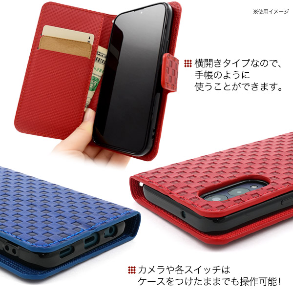 | 存在感抜群!市松模様レザーデザインの手帳型ケース。 衝撃やキズなどからスマホを守ります。 また、内部はソフトケースなので着脱が簡単です。 背面を折り返すとスタンドとして使用できるので、動画視聴に便利です。 落下防止に便利なストラップとストラップホール付きです。 横開きタイプなので、手帳のように使うことができます。 また、内側に2つのカードポケットとサイドポケットが付いています。 | ||||||||||||||