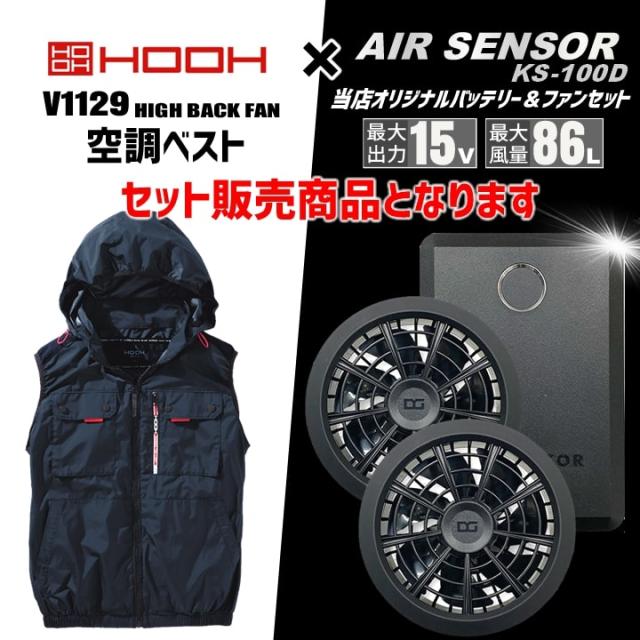 【即日発送】【特別セット割引中】空調服 ハイバック ベスト HOOH 2025年モデル V1129 バッテリー&ファンセット クロダルマ KS-100 エアーセンサー 裏チタン UVカット フードジャケット フルハーネス対応 空調作業服 フルセット ファン付きウェア 村上被服