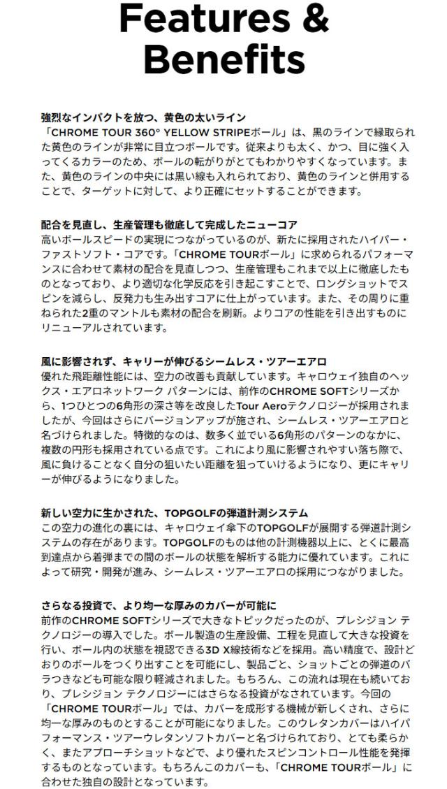 飛距離などの性能は、通常のCHROMETOURボールと同じで、専用設計のハイパー・ファストソフト・コアは、素材の配合を新しくしたことなどで、優れた反発力を発揮するものとなっており、ボールスピードが大きく向上。