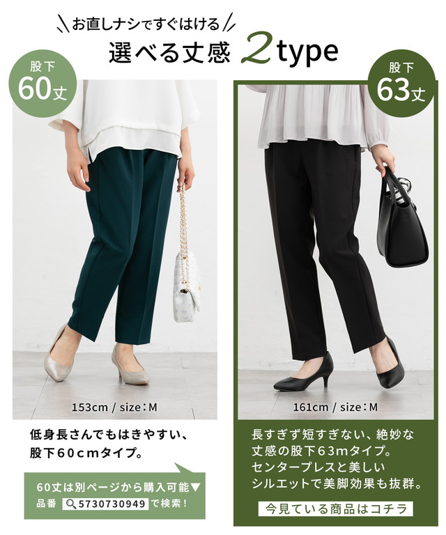 きちんと感のあるセンタープレスと、腰回りのラインにこだわった、裾に向かって細くなる美しいシルエットで美脚効果も抜群。