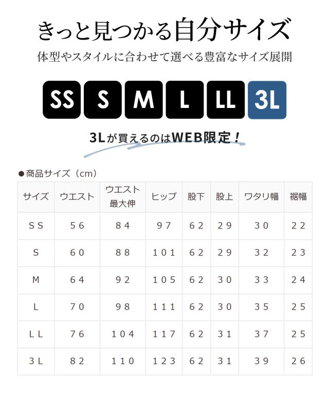 [3L]ウエスト82・ウエスト最大伸110・ヒップ123・股下62・股上31・ワタリ幅39・裾幅26
