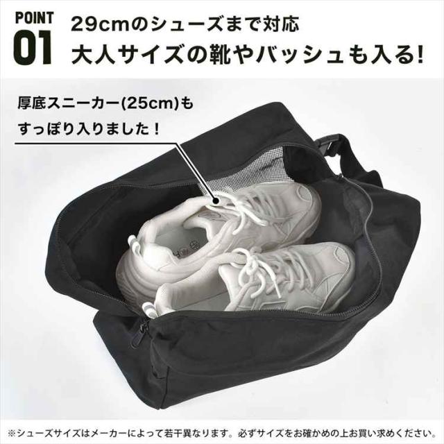 最大29cmの大人用靴が入る収納力!広めのマチがあるので、バッシュやスパイクのような大きめのスポーツシューズも入ります。