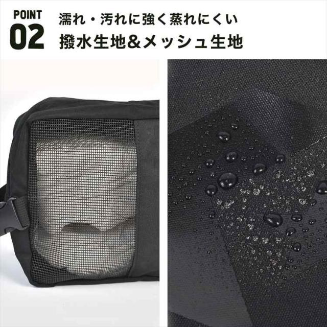 全体には撥水加工がされた生地を使用し、上部はメッシュ生地を採用。濡れや汚れに強く手入れが簡単で、内部が蒸れにくいシューズバッグです。