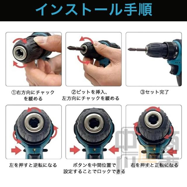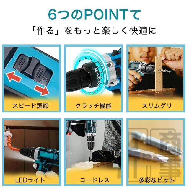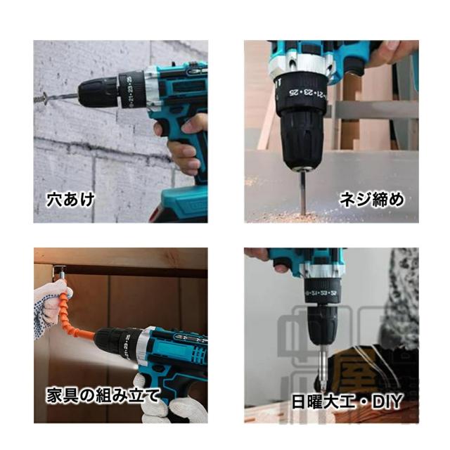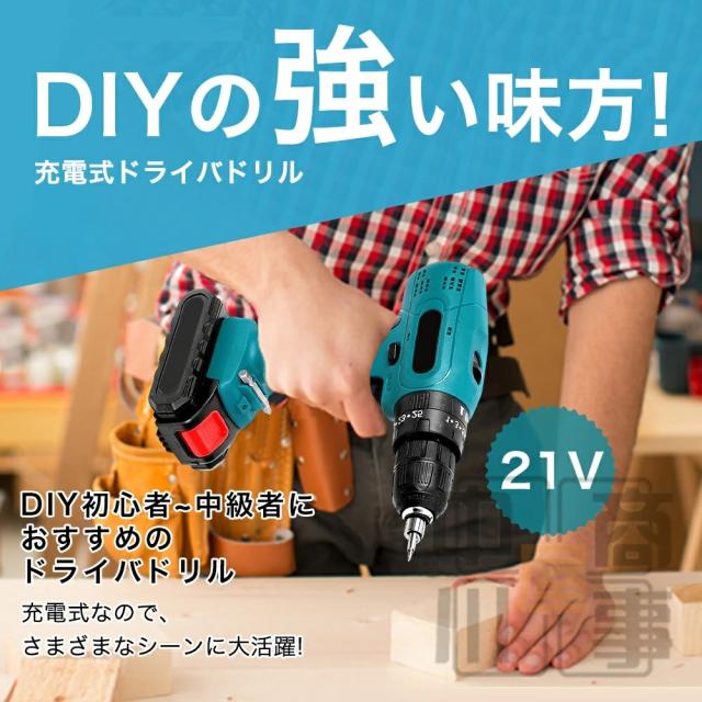 【21V高性能電動ドライバーセット】 1台3役 充電式電動ドリルとドライバーとして使用でき、家具の組立、木材の穴開け、ネジ締めなど様々な作業で活躍します。