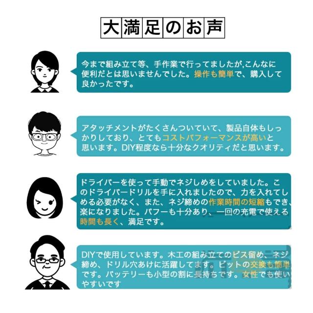 - 使用頻度はかなり少ないので高い工具を購入するのも気が引けてた所でこの商品を見つけました。バッテリーも2個付属しており力もあり、交換部品も多数付属してこのお値段なら申し分無しと思います。強いて言うならケ...