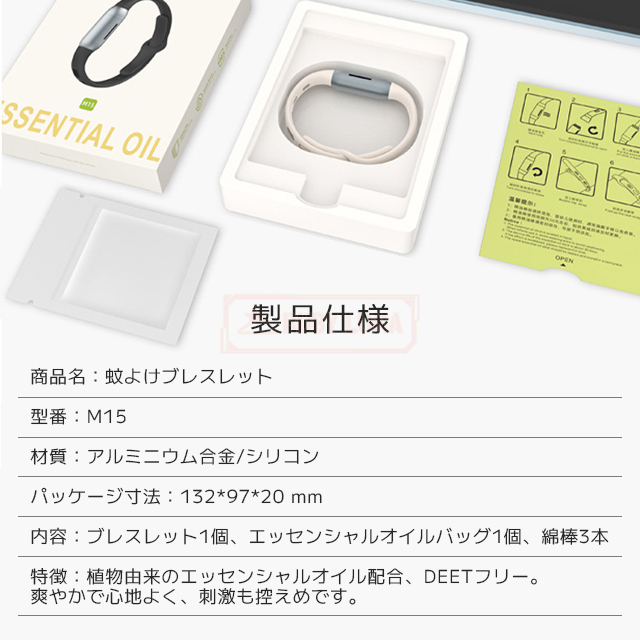 | 内容 | ◆ブレスレット1個、エッセンシャルオイルバッグ1個、綿棒3本 |