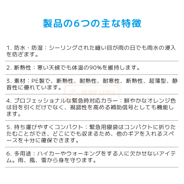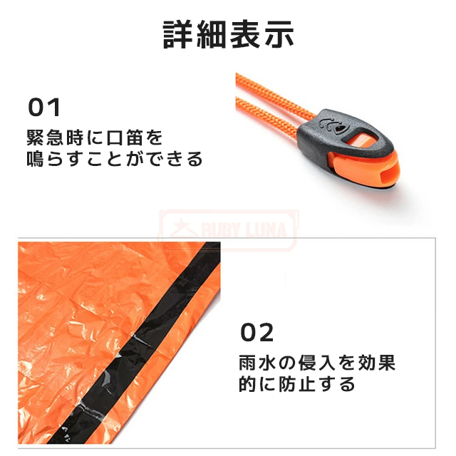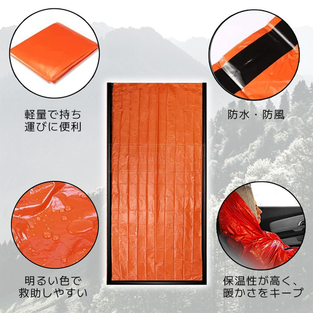 | 説明 | ◆想定外の遭難や被災時等の緊急事態時が起きた際に、非常用防災用テントとしてご使用いただけます。 ・エマージェンシーシェルターなら、ちょっとした雨宿りでも気軽にお使いいただけます。 ・耐久性に優れた素材を採用、片面にはアルミ蒸着加工をしているため、薄手でも保温性が高くなります。 ・寝袋やシートなど、工夫していろいろとご活用ください。 ・地震などの災害時の装備としてもお勧めです。 |