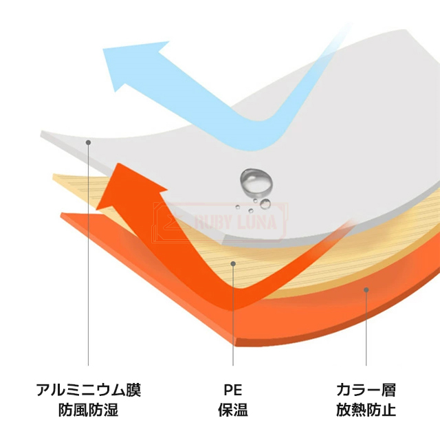 | 「耐候性に優れた素材」 | ◆PEアルミコーティングを施した耐久性に優れた素材を採用しています。 ◆急な天候変化に対応し、災害時の避難用具としても、また家族のアウトドア活動にも適しています。 |