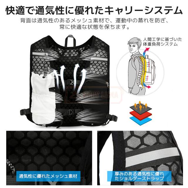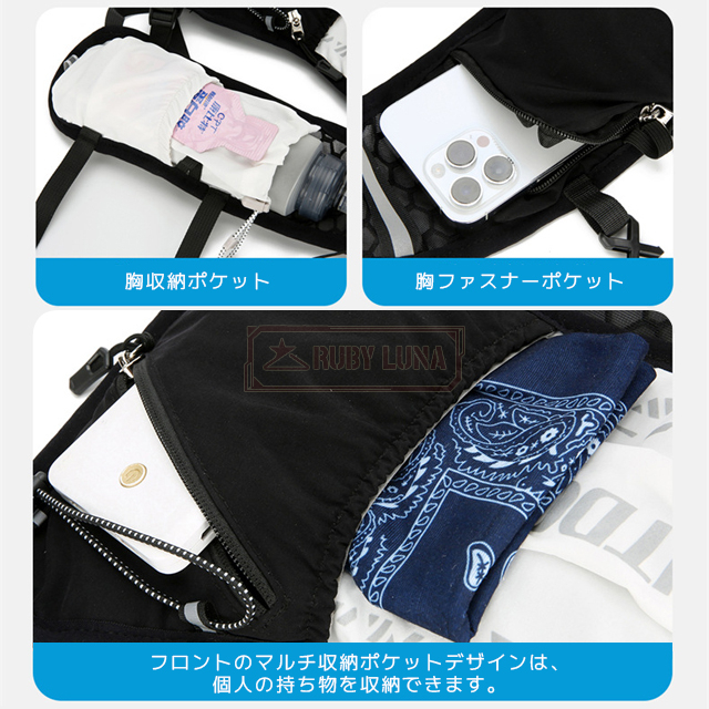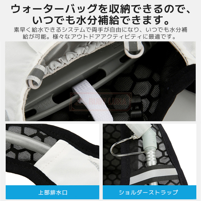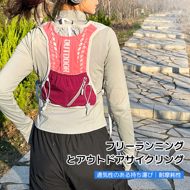 | 特徴 | ◆背負ったまま水分補給できる、ハイドレーションパック対応 ◆背面部分にソフトボトルを入れ、歩きながら走りながら吸引チューブを使用し水分補給できる ◆鍵、財布、電話、現金などの小さなアイテムすべてを収納することができます。十分なスペースがあり、ボトルや財布、鍵などの小物を収納できます。 ◆調節可能で、完璧なフィットを保証し、ランニング中にパックが跳ね返るのを防ぎます。 ◆背中とバックパックの間に空気の流れを許すユニークなパッド入りデザインです。 ◆光反射ライン付け、夜間にウォーキングしても大丈夫です。 |